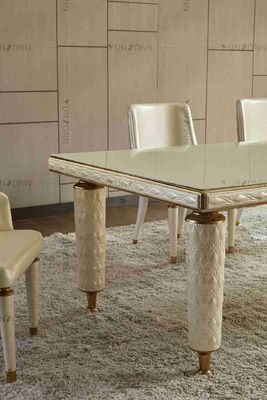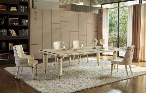 Table de salle à manger avec le cadre blanc d'acier inoxydable de dessus de verre trempé de couverture de cuir de broderie pour la maison