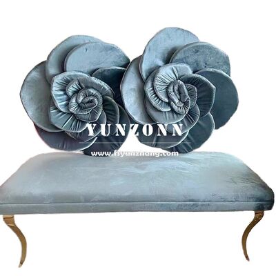 Un canapé en acier inoxydable moderne avec un dos de fleur de rose, un siège en velours rouge rose pour un mariage.
