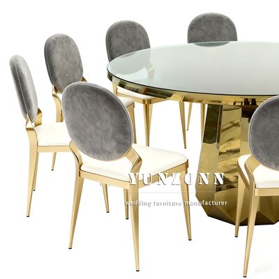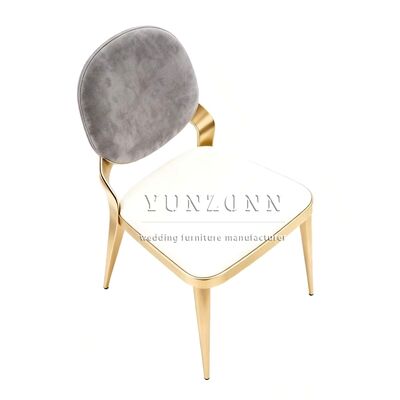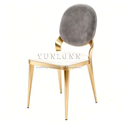 Chaises de banquet d'hôtel de mariage d'événement empilables en métal de luxe en gros et en tissu gris avec dossier rond et or à vendre |