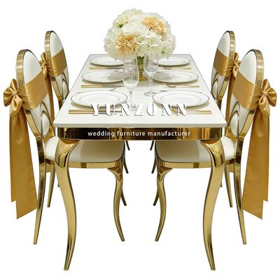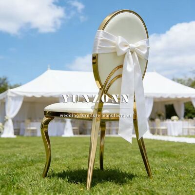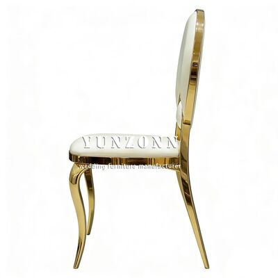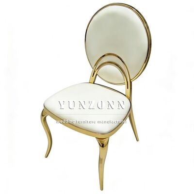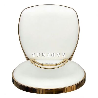 | Nom du produit: | Hôtel pas cher Fête de mariage Événements Meubles Blanc PU Coussin or en acier inoxydable Dos rond Chaise à manger Marié et mariée |
