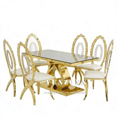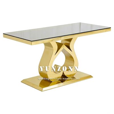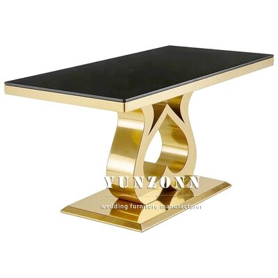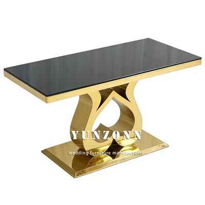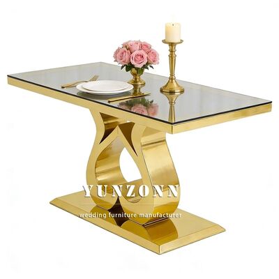 | Nom du produit: | Hôtel pas cher Événements Fêtes Meubles de mariée Mariée et marié Table d'or en acier inoxydable verre haut Rectangle mariage tables à manger |