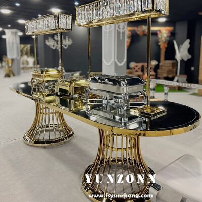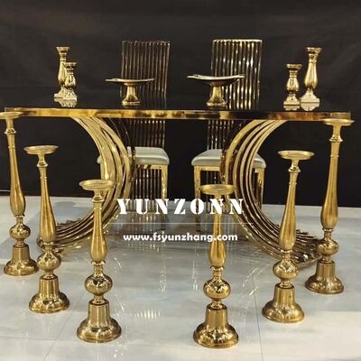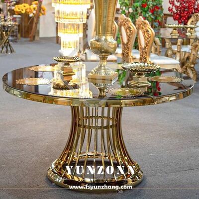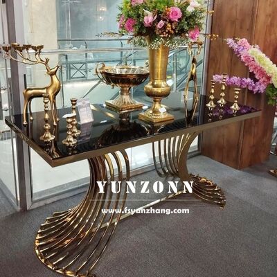 | Nom du produit: | Table de salle à manger en verre en acier inoxydable doré de luxe pour mariage, pour utilisation hôtelière, mobilier d'événement élégant |