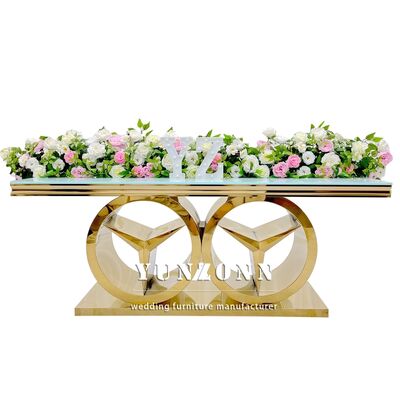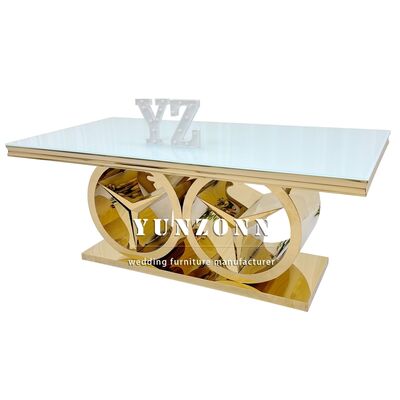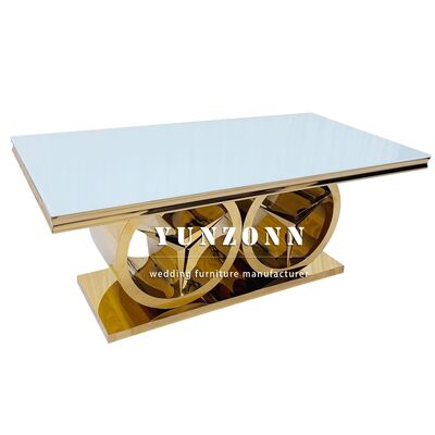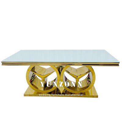 | Nom du produit: | Table de salle à manger rectangulaire moderne en or avec base Benz, mobilier de luxe pour événements de mariage, utilisation extérieure et hôtelière, plateau en verre/MDF |